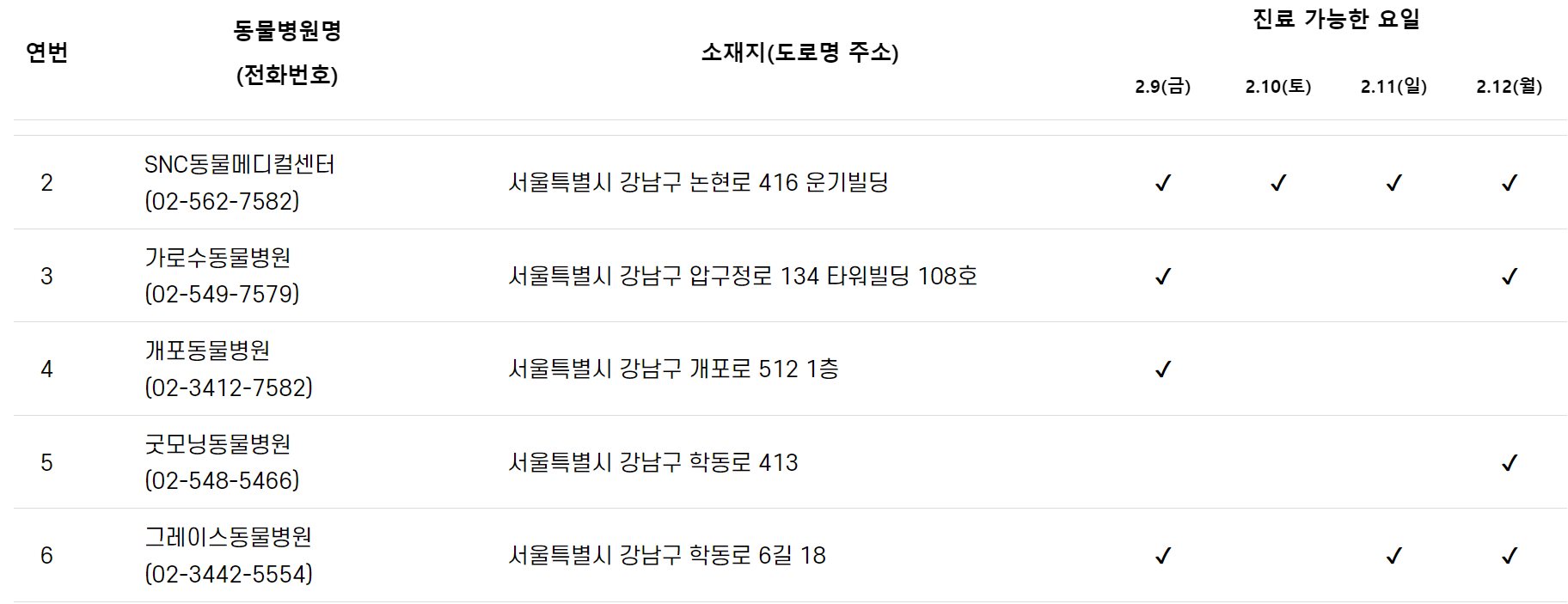설 연휴기간의 동물병원 운영현황을 지역 검색시 바로 확인하실수가 있고 4일간의 연휴기간중 진료가능한 요일까지 상세히 표시되어 있기 때문에 가까운 동물병원을 검색해 이용하기에 좋습니다.