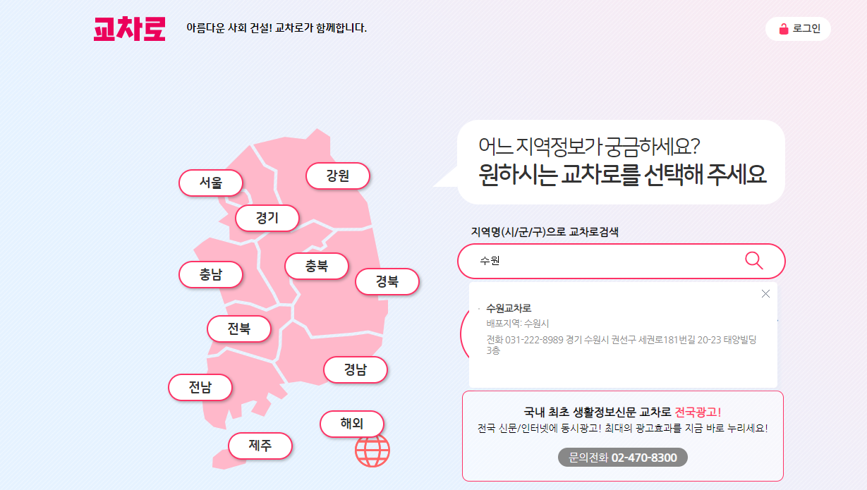 바로가기 버튼을 이용하면 교차로 공식홈페이지에서 지역명을 검색해 수원교차로 메인홈으로 이동해야하는 번거로움 없이 수원교차로 구인구직 사이트로 바로 이동 가능합니다.