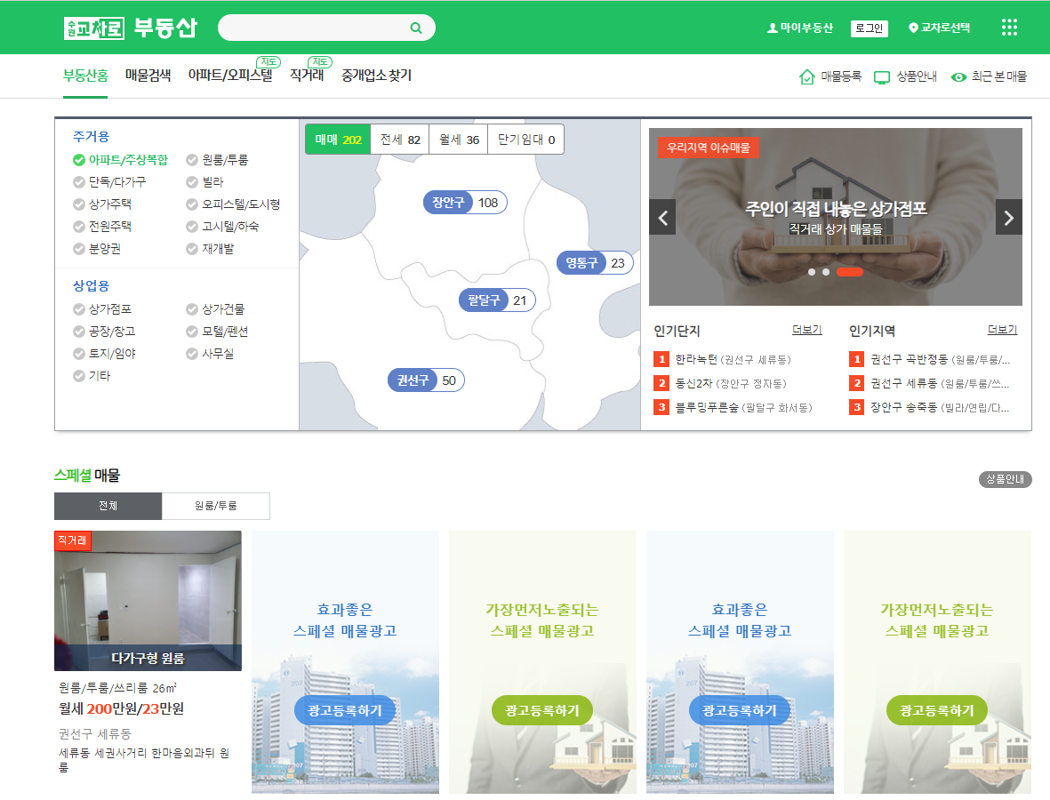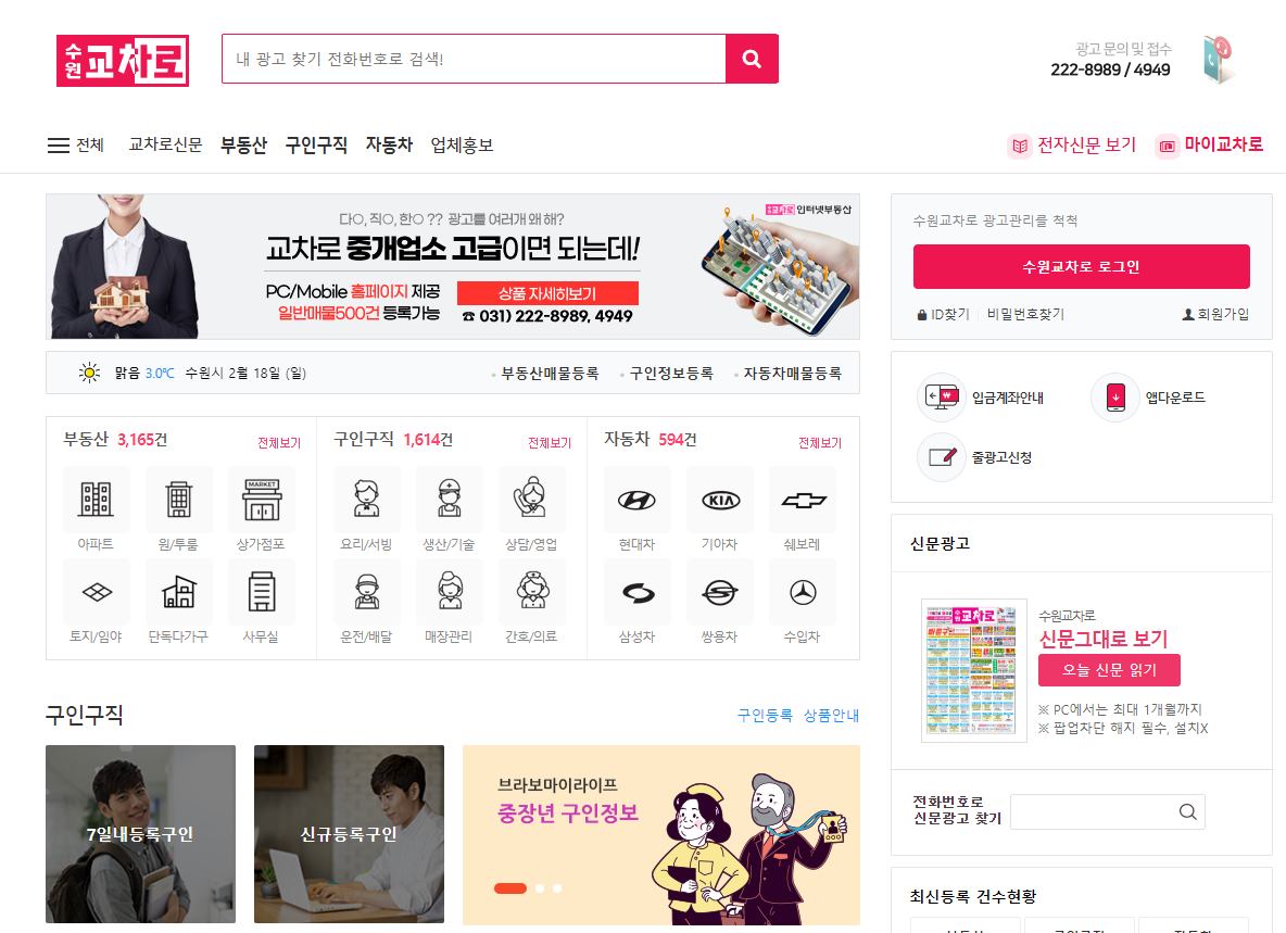 수원교차로는 수원교차로 메인사이트가 있고 수원의 부동산정보, 자동차정보, 구인구직 사이트가 각각의 홈페이지를 가지고 따로 가지고 있으며 홈페이지를 색상으로 잘 편집해 놓아서 이용하기가 편했습니다.