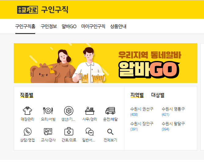 수원교차로 구인구직 사이트에는 직종별, 지역별, 대상별로 구분지어져 있어서 구직자가 내가 원하는 직종의 일자리를 쉽게 찾아볼 수 있도록 해놓았습니다.