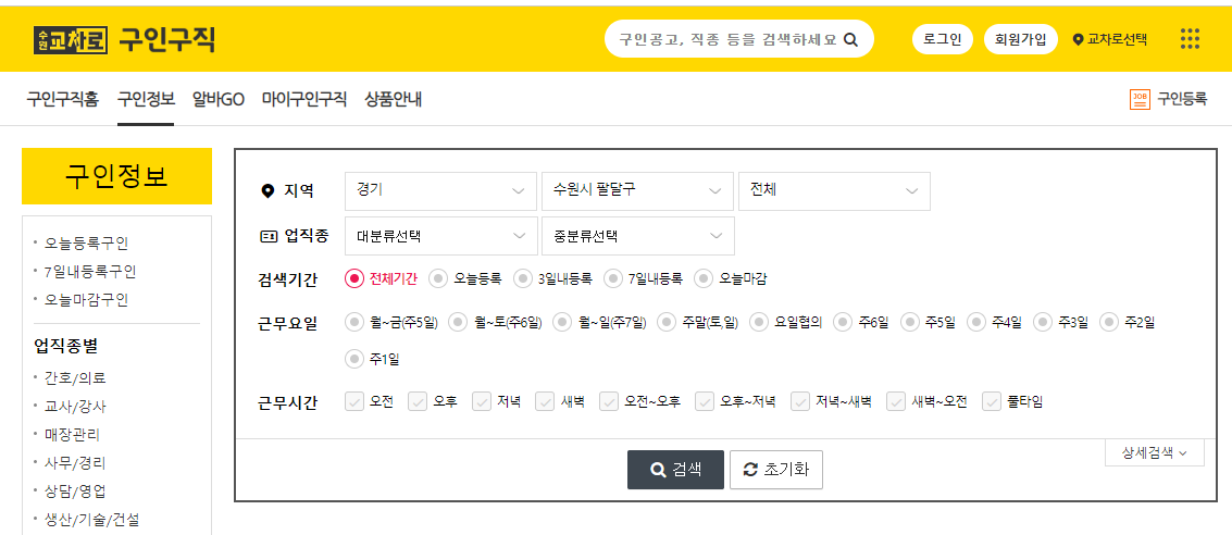 수원교차로 구인구직 사이트에서는 구인정보 검색시 지역과 업종뿐 아니라 근무요일과 근무시간까지 선택해서 상세히 검색할 수 있어서 구직희망자들이 사용하기에 편리합니다.