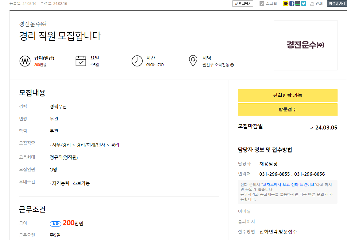 구인정보를 상세히 보려면 관심있는 구인광고를 클릭하면 되고 이때 근무조건과 전화연락이 가능한지 방문접수만 되는지 등 상세한 정보를 확인 할 수 있습니다.