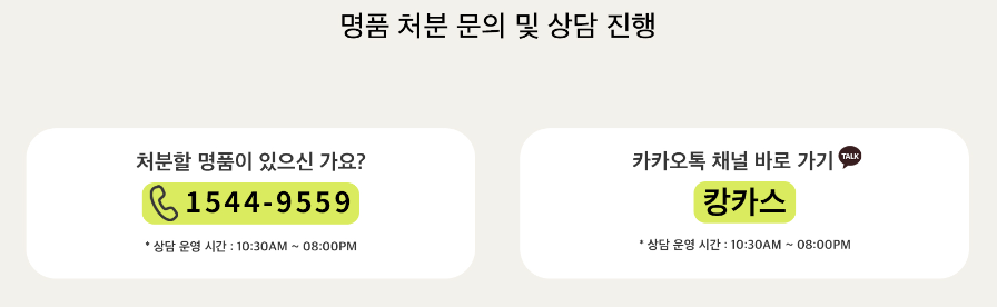지방에 거주하거나 방문이 어려운 고객을 위해 무료택배를 통해 처분할 수 있는 시스템이 마련되어 있습니다. 처분을 맡길 명품과 통장사본, 신분증 사본을 함께 넣어 택배로 보내면 감정과정을 거쳐 고객에게 연락들 하고 처분하는 방식입니다.