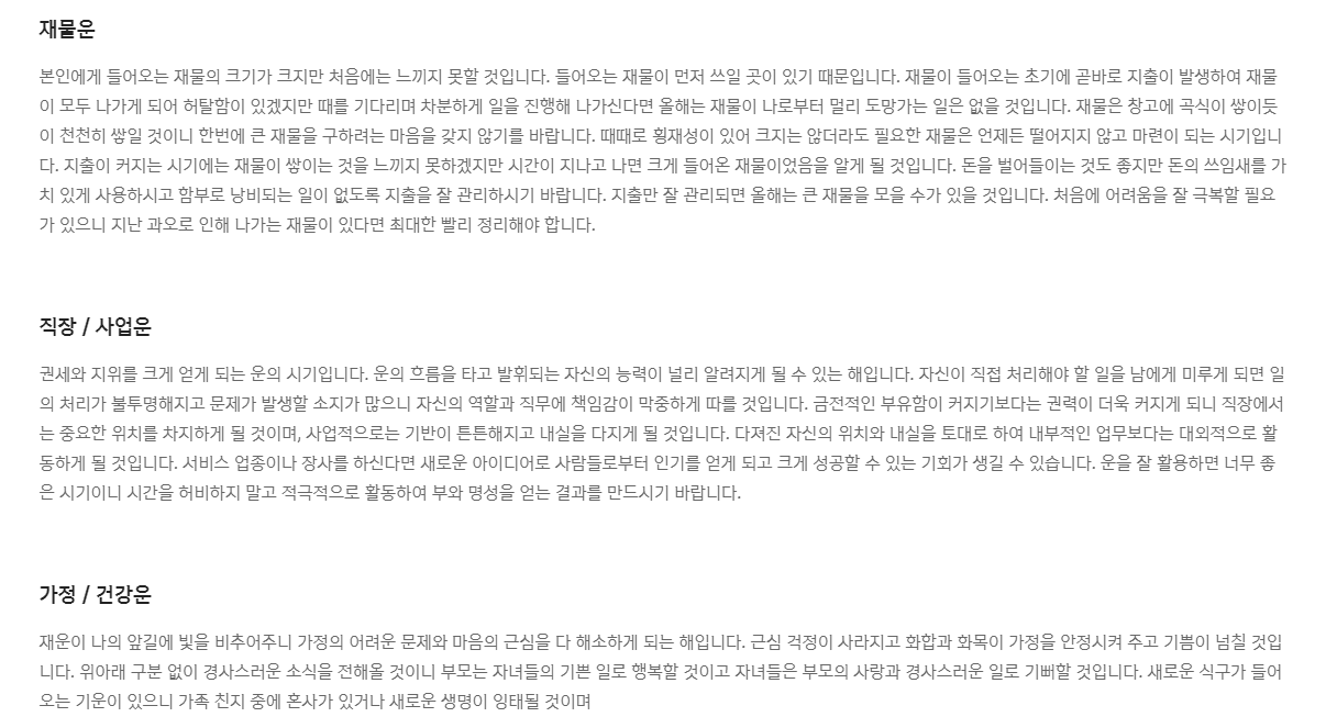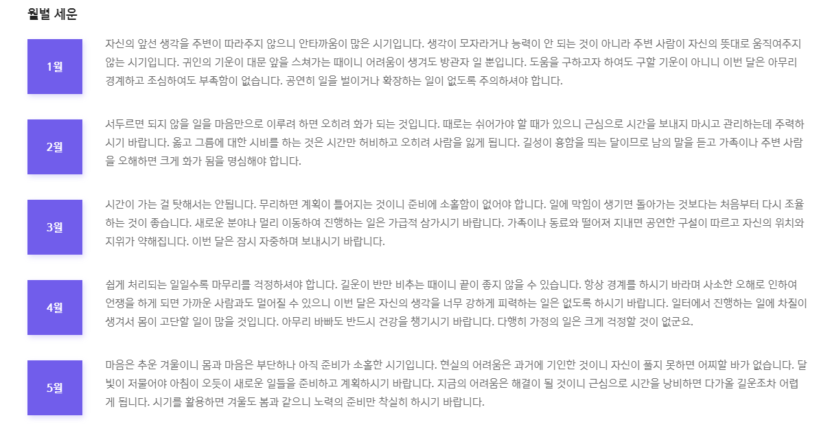 결과는 이렇게 재물운, 직장운, 가정운, 월별 운 등으로 자세히 기록되어 나옵니다. 또 월별 운세도 볼 수 있습니다.