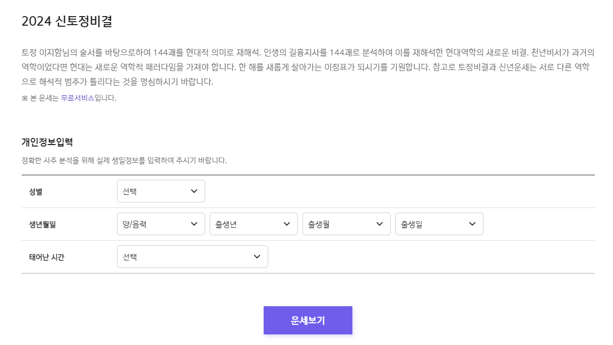 개인정보입력란에 성별과 생년월일과 태어난 시간도 정확히 아셔야 좀더 정확한 신년토정비결을 보실 수가 있습니다. 태어난 시간까지 입력해야 하기 때문에 더 믿음이 갑니다.