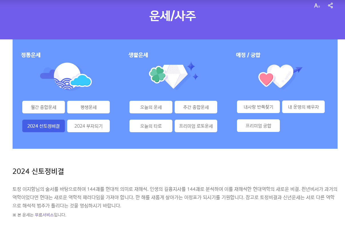 보통 무료토정비결이라고 해서 들어가 보면 회원가입이나 인증을 요구하거나 유료상담으로 연결하는 경우가 많은데요. 이곳의 토정비결은 자세히 알려주는 반면 회원가입을 하지 않고 바로 확인할 수 있어 편리합니다.