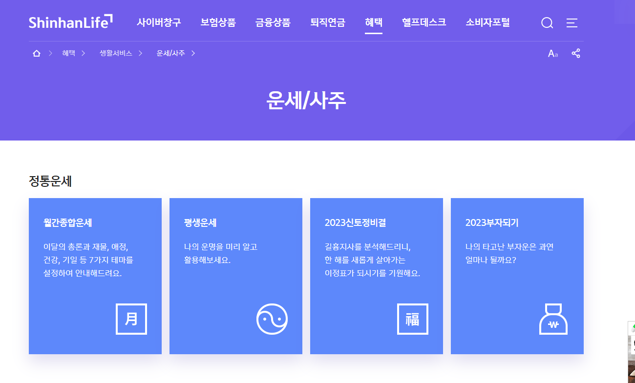 신한라이프 홈페이지 생활서비스 카테고리로 들어간 후에 운세/사주를 선택해도 되고 메인화면 아래쪽에 있는 운수/사주 바로가기로 들어가도 바로 이용할 수 있어 편리합니다. 운수 / 사주바로가기를 클릭하면 토정비결을 볼 수 있는 화면으로 넘어갑니다.